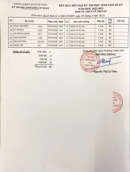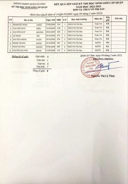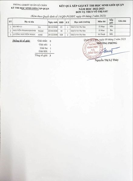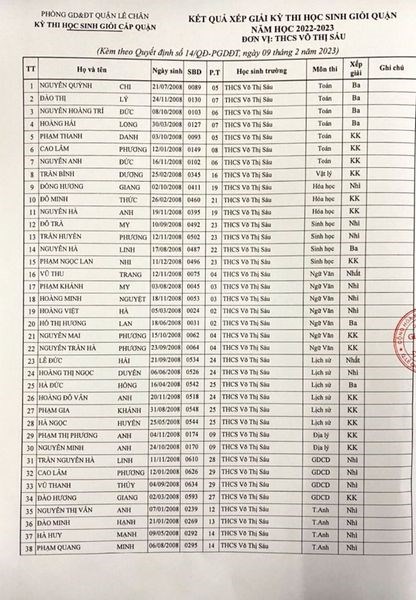 Chúc mừng các em học sinh trường THCS Võ Thị Sáu đã đạt giải trong Kỳ thi học sinh giỏi cấp quận năm học 2022 - 2023.